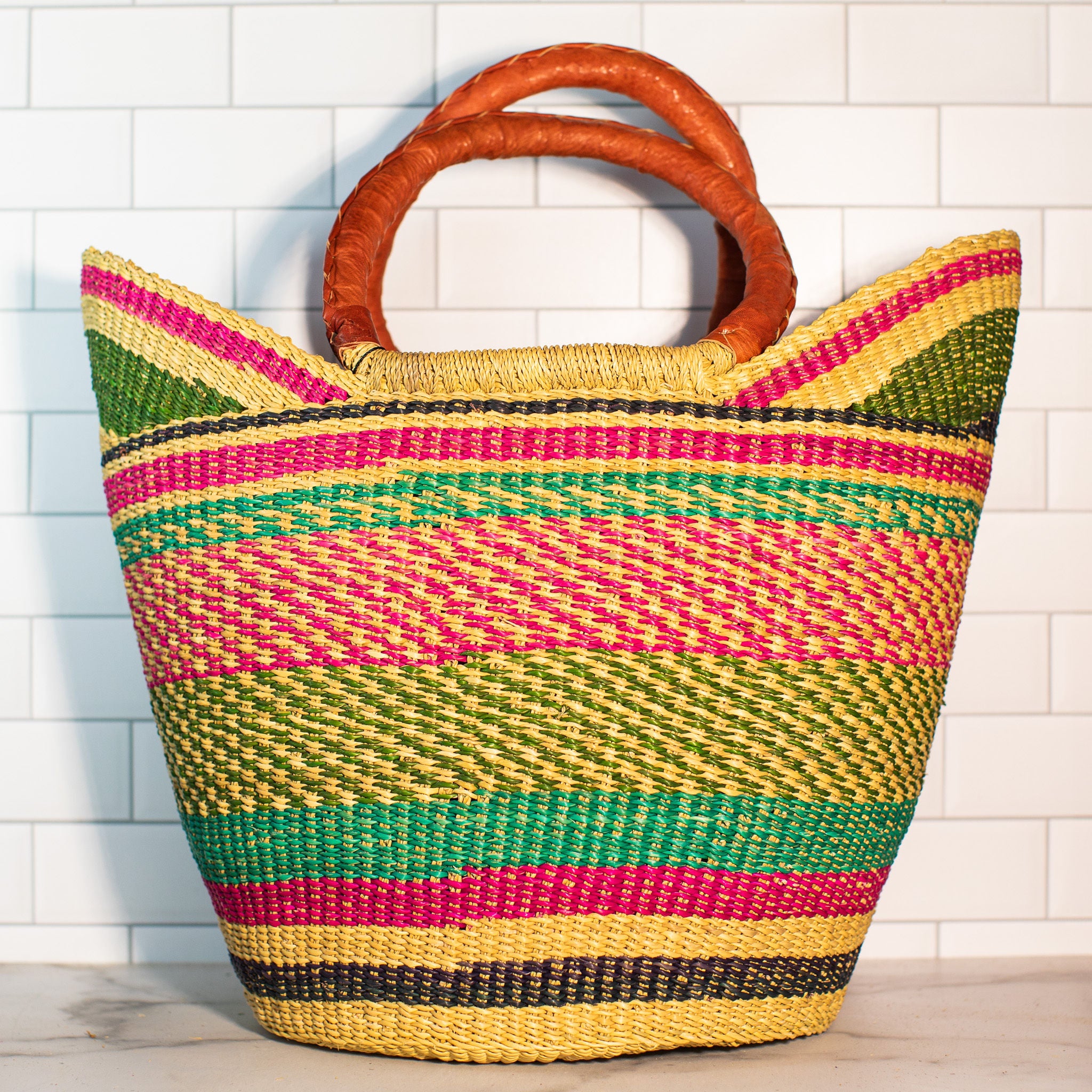 Handwoven from elephant grass and finished with a sturdy leather handle, each basket is beautiful and unique - just like the women and girls who weave them. Made in Ghana, this basket supports fair trade practices, ensuring that each purchase makes a positive impact on the lives of the artisans who create them.