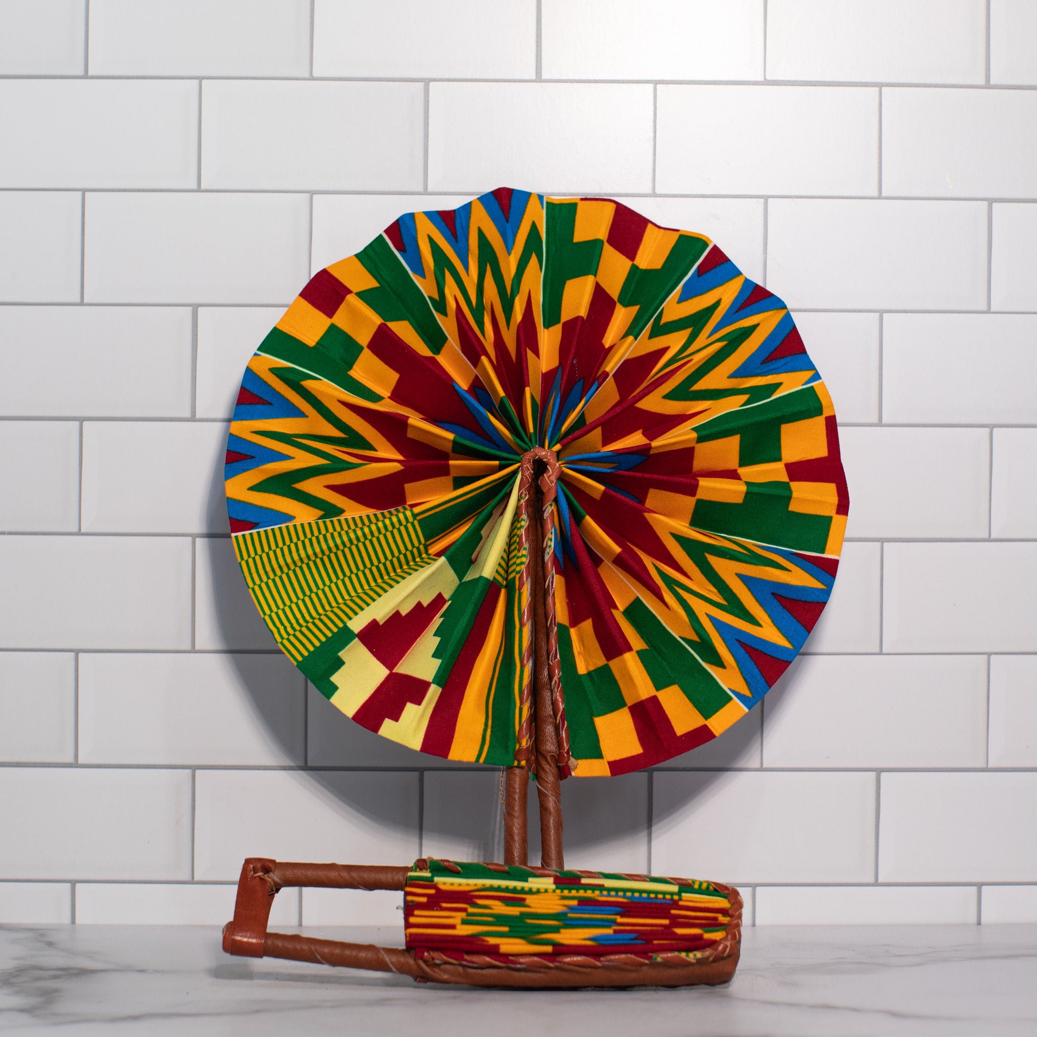 This handmade African fan is perfect for staying cool on hot days or in hot places. As a vibrant accessory and practical tool, it adds a touch of flair to events, serves as a unique decorative piece, and easily folds for portability.