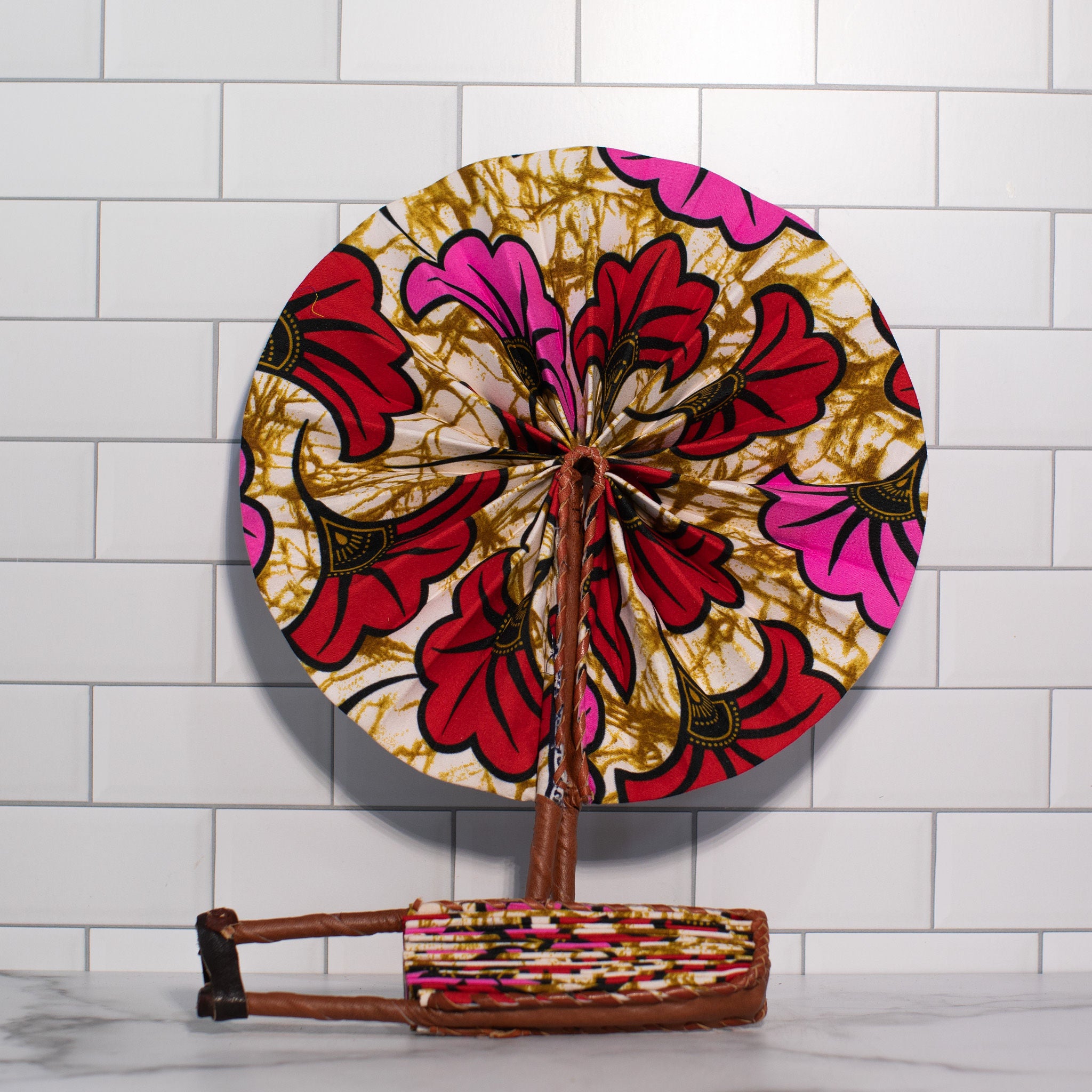 This handmade African fan is perfect for staying cool on hot days or in hot places. As a vibrant accessory and practical tool, it adds a touch of flair to events, serves as a unique decorative piece, and easily folds for portability.