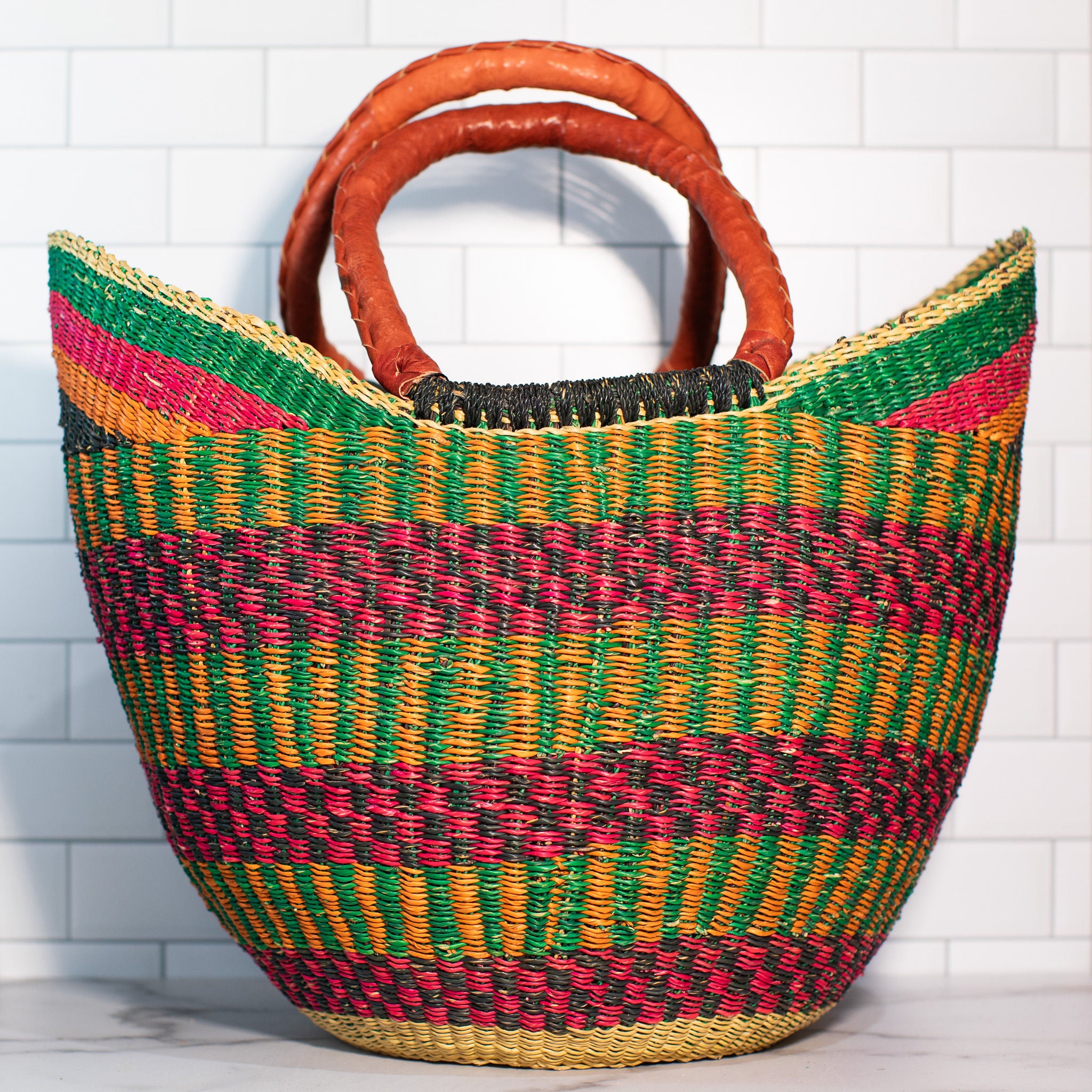 Handwoven from elephant grass and finished with a sturdy leather handle, each basket is beautiful and unique - just like the women and girls who weave them. Made in Ghana, this basket supports fair trade practices, ensuring that each purchase makes a positive impact on the lives of the artisans who create them.