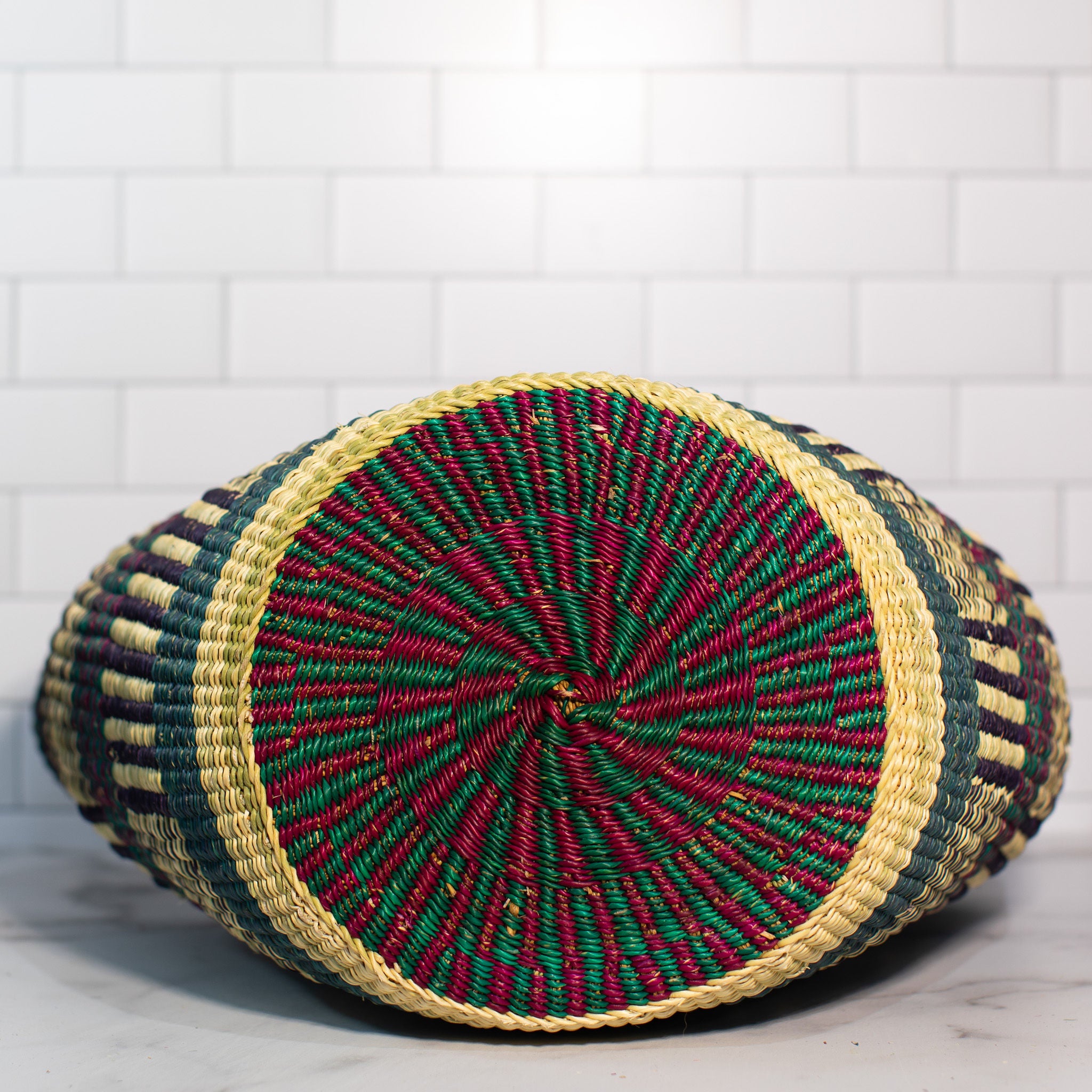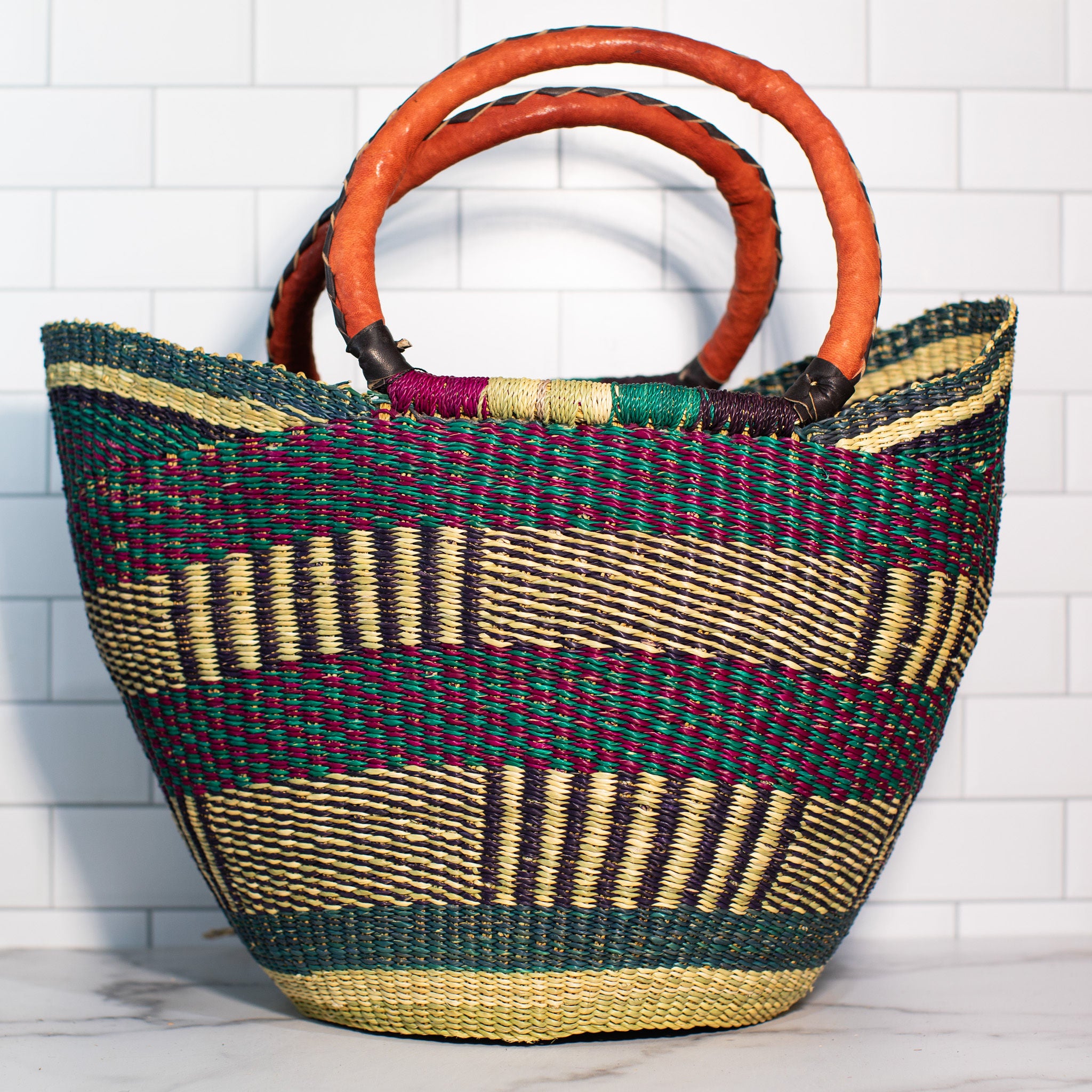 Handwoven from elephant grass and finished with a sturdy leather handle, each basket is beautiful and unique - just like the women and girls who weave them. Made in Ghana, this basket supports fair trade practices, ensuring that each purchase makes a positive impact on the lives of the artisans who create them.