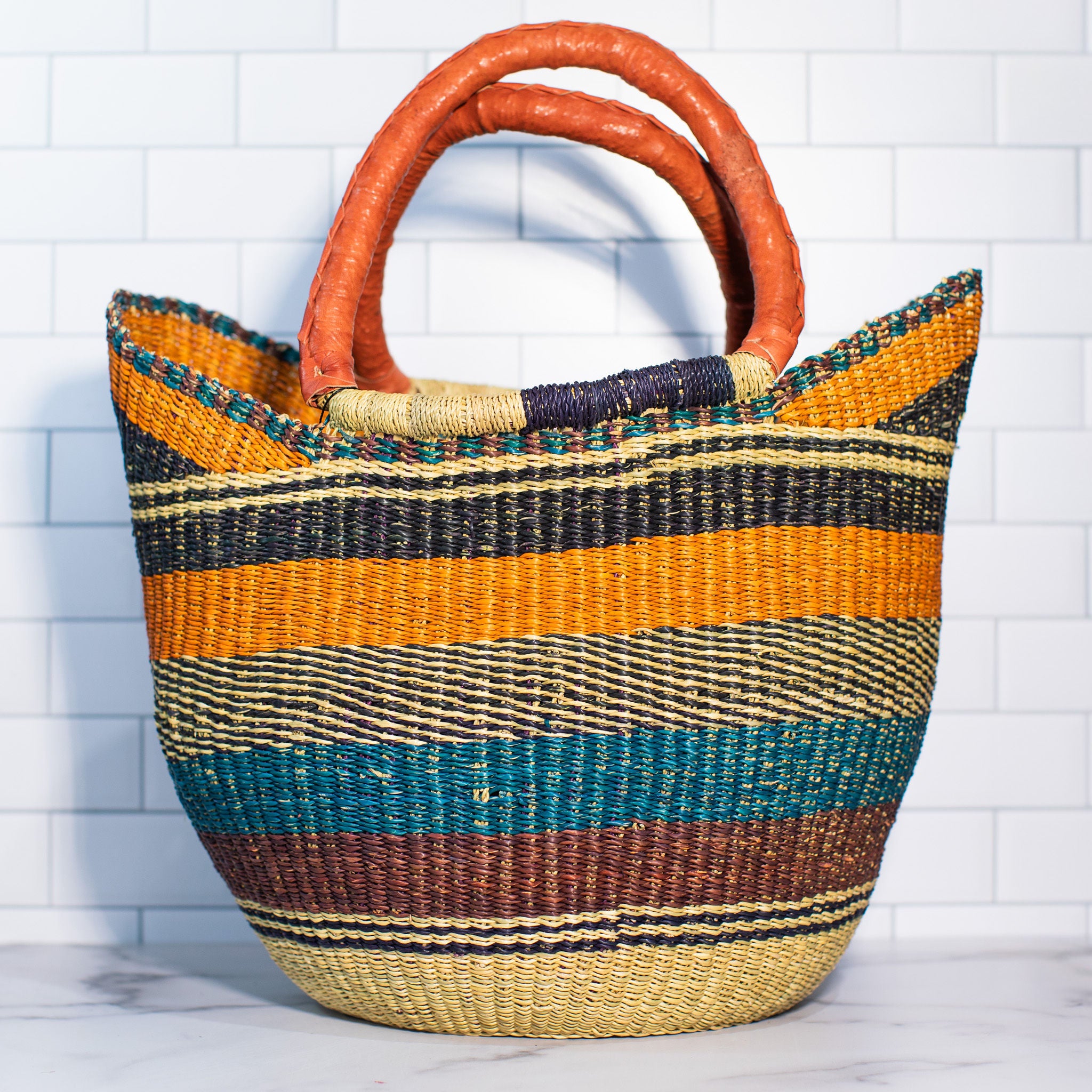 Handwoven from elephant grass and finished with a sturdy leather handle, each basket is beautiful and unique - just like the women and girls who weave them. Made in Ghana, this basket supports fair trade practices, ensuring that each purchase makes a positive impact on the lives of the artisans who create them.
