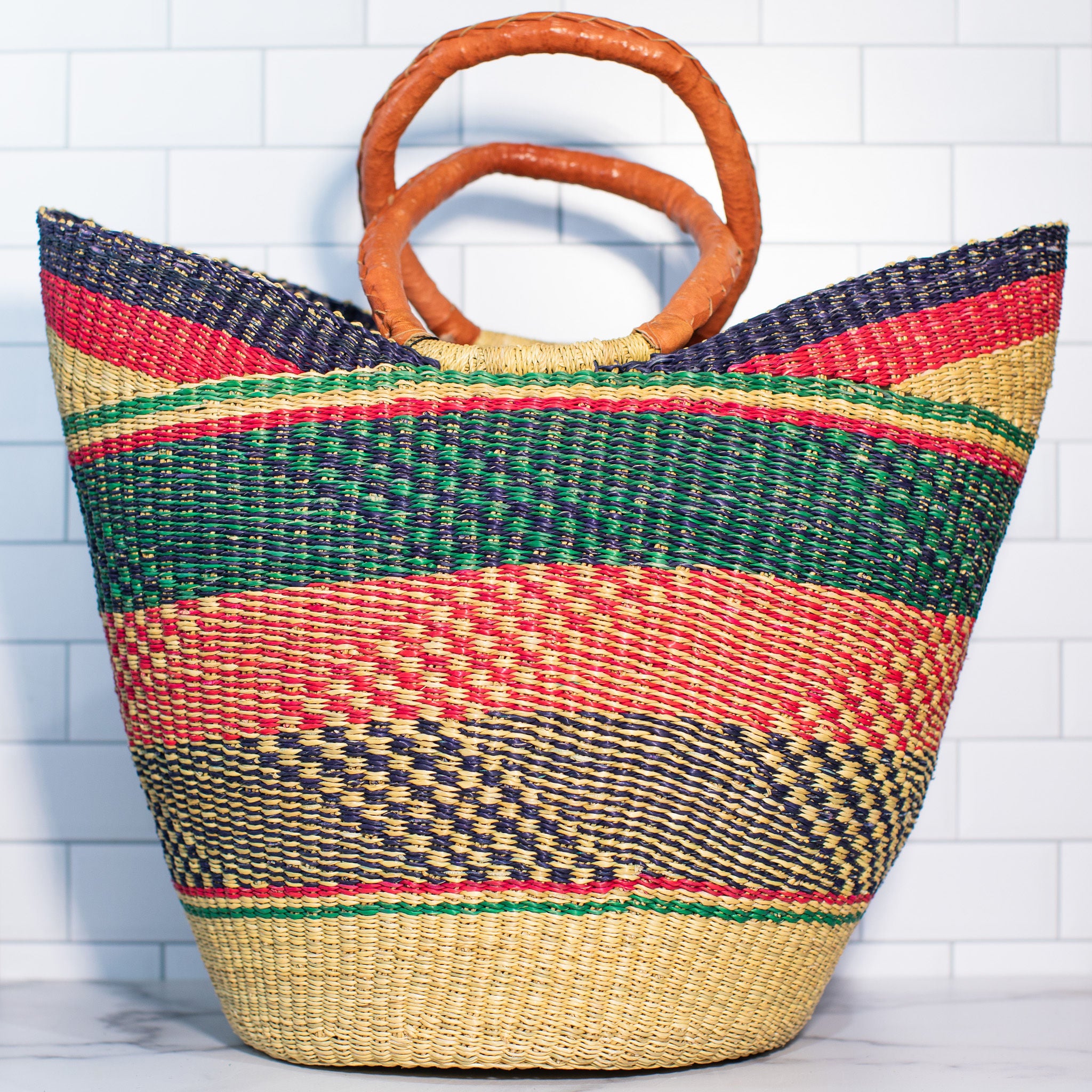 Handwoven from elephant grass and finished with a sturdy leather handle, each basket is beautiful and unique - just like the women and girls who weave them. Made in Ghana, this basket supports fair trade practices, ensuring that each purchase makes a positive impact on the lives of the artisans who create them.