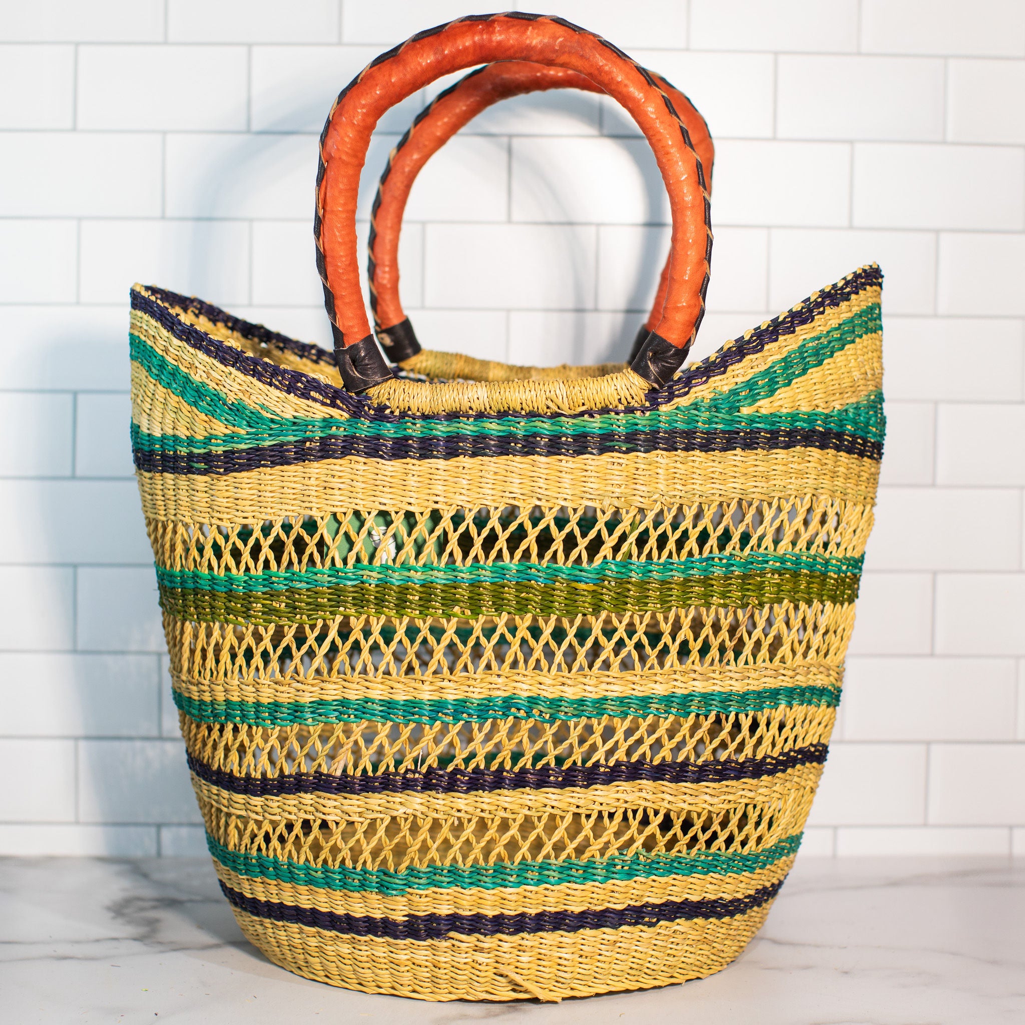 Handwoven from elephant grass and finished with a sturdy leather handle, each basket is beautiful and unique - just like the women and girls who weave them. Made in Ghana, this basket supports fair trade practices, ensuring that each purchase makes a positive impact on the lives of the artisans who create them.