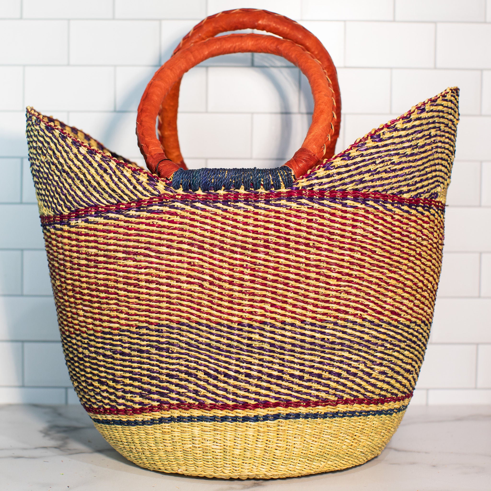 Handwoven from elephant grass and finished with a sturdy leather handle, each basket is beautiful and unique - just like the women and girls who weave them. Made in Ghana, this basket supports fair trade practices, ensuring that each purchase makes a positive impact on the lives of the artisans who create them.