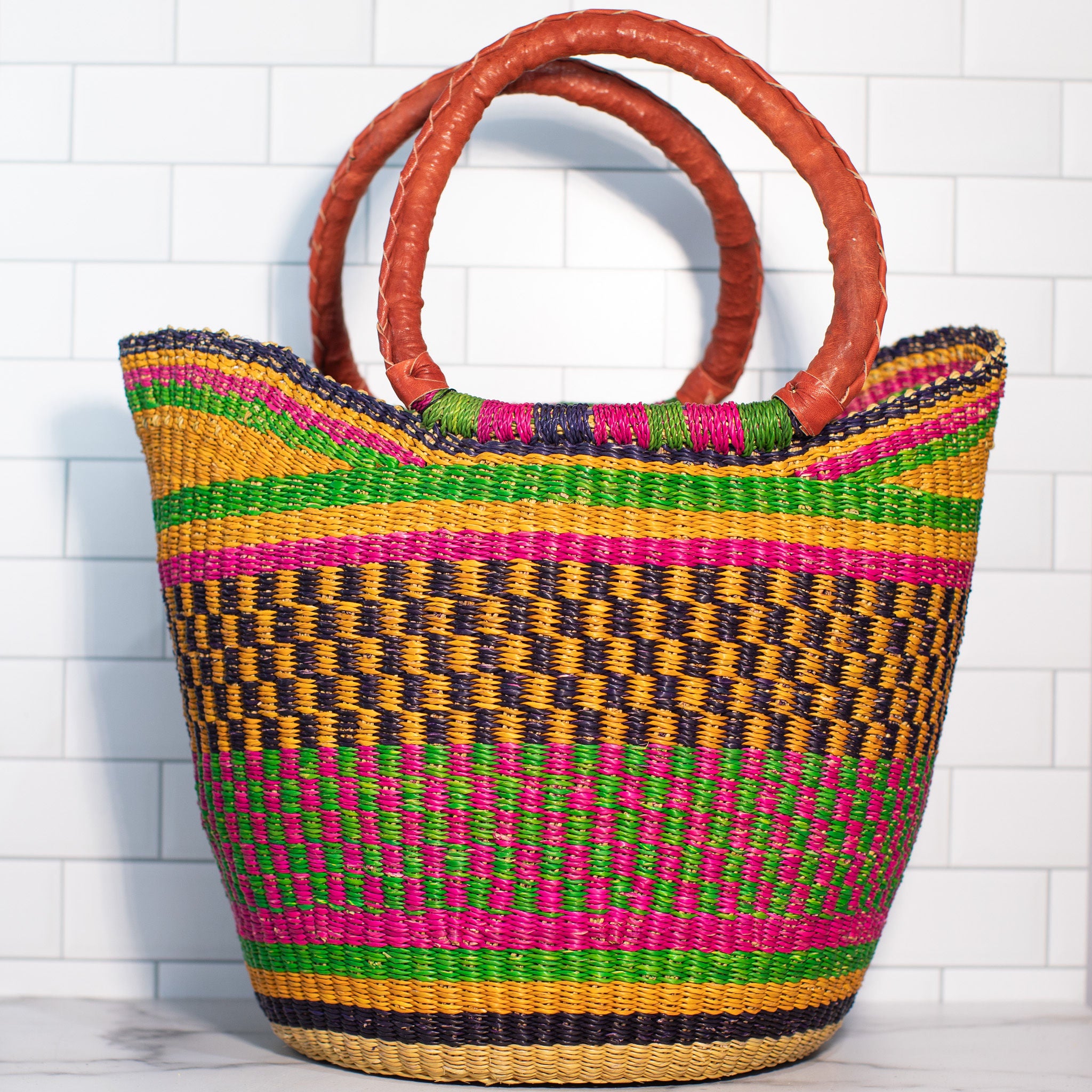 Handwoven from elephant grass and finished with a sturdy leather handle, each basket is beautiful and unique - just like the women and girls who weave them. Made in Ghana, this basket supports fair trade practices, ensuring that each purchase makes a positive impact on the lives of the artisans who create them.